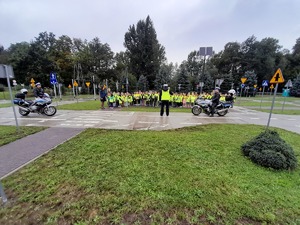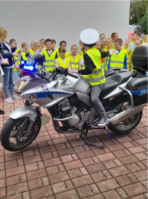 Jana Pawła II w Starym Wiśniczu. Mundurowi oraz Naczelnik wydziału prowadzili tam działania profilaktyczne związane z akcją „Bezpieczny pieszy” i „Bezpieczny rowerzysta”. W trakcie spotkania funkcjonariusze przedstawili dzieciom najważniejsze informacje związane z prawidłowym zachowaniem na drogach. W sposób budzący zainteresowanie najmłodszych, pokazali co w ruchu pieszych jest bezpieczne, a co może spowodować zagrożenie. Policjanci uczulali, aby zawsze korzystać z przejść dla pieszych oraz chodnika i nie przebiegać przez jezdnię oraz nie wybiegać na nią zza pojazdu lub innej przeszkody. Szeroko omówili także przepisy związane z zakazem korzystania z telefonu lub innego urządzenia elektronicznego podczas przechodzenia przez jezdnię, gdyż utrudnia to możliwość jej obserwacji. Funkcjonariusze na przykładach wskazali największe błędy i zagrożenia związane z niestosowaniem się do przepisów. Mundurowi omówili także zasady bezpieczeństwa rowerzystów, wskazując tutaj, choćby na prawidłowy stan techniczny roweru. Przedstawione zostały również przepisy związane z korzystaniem z hulajnogi elektrycznej. Po części teoretycznej uczniowie otrzymali od mundurowych elementy odblaskowe oraz mogli zobaczyć policyjne radiowozy i motocykle.