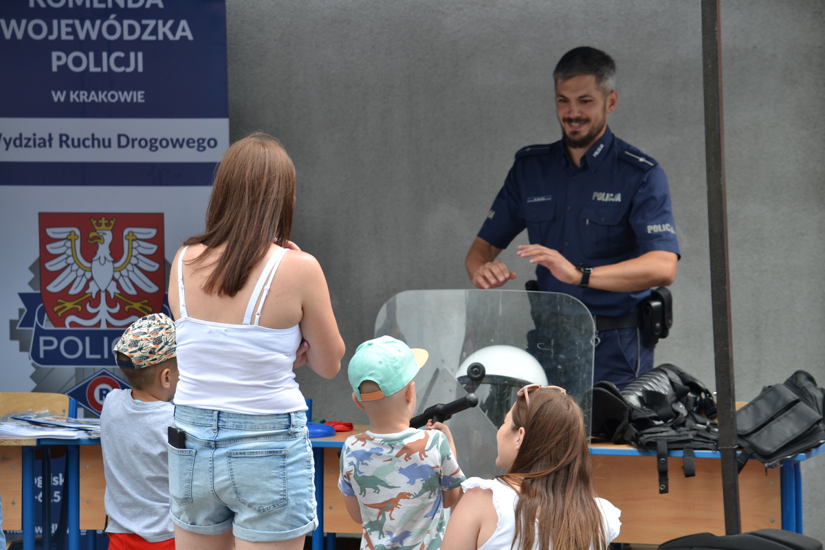 Jednym z głównych zagadnień poruszanych w czasie trwania imprezy było bezpieczeństwo na drodze podczas wakacji. Funkcjonariusze prowadzili konkursy o tematyce ruchu drogowego, najmłodsi otrzymywali opaski i zawieszki odblaskowe, a także ciekawe nagrody. Wręczane były ulotki zawierające przepisy dotyczące pieszych oraz kierujących hulajnogami elektrycznymi i urządzeniami transportu osobistego. Funkcjonariusze udzielali porad prawnych z zakresu ruchu drogowego, przestrzegali przed niebezpiecznymi zachowaniami na drodze. Dużym zainteresowaniem cieszył się pokaz radiowozu i motocykla policyjnego przy których dzieci i młodzież chętnie pozowali do zdjęć. Dodatkową atrakcją była możliwość skorzystania z symulatora dachowania, obsługiwanego przez instruktora nauki jazdy z Moto – Park Kraków. Chętni mieli niepowtarzalną okazję doświadczyć tego, co czuje osoba siedząca w pojeździe podczas dachowania, oraz sprawdzić dlaczego tak ważne są prawidłowo zapięte pasy bezpieczeństwa w trakcie wypadku oraz zobaczyć co dzieje się wtedy z przedmiotami luźno przewożonymi w samochodzie.Dzięki słonecznej pogodzie, zabawa połączona z edukacją mogła trwać aż do późnych godzin popołudniowych.