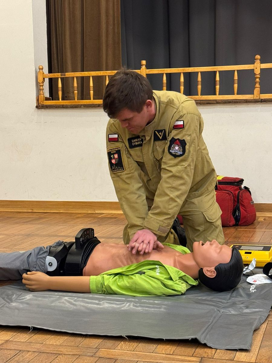 Na spotkaniu obecni byli również strażacy Państwowej Straży Pożarnej, którzy prowadzili ćwiczenia z udzielania pierwszej pomocy przedmedycznej.