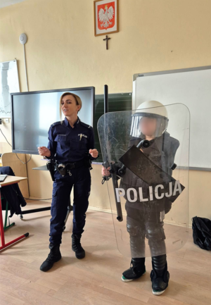 Zebrani uczniowie mieli także możliwość przymierzyć policyjny sprzęt oraz elementy policyjnego umundurowania, które zostały szczegółowo opisane.