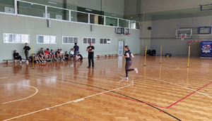 1) rzut oburącz zza głowy do przodu piłką lekarską o ciężarze 3 kg;